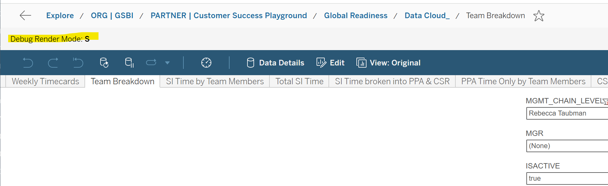 2.URLに、例えばiid=2があれば?:iid=2&:jsdebug=y&:refresh=y&:render=false を付けてアクセスしてみていただけますでしょうか。なければもう一度:iid=2&の部分をなくした?:jsdebug=y&:refresh=y&:render=false をつけてアクセスをお試しください